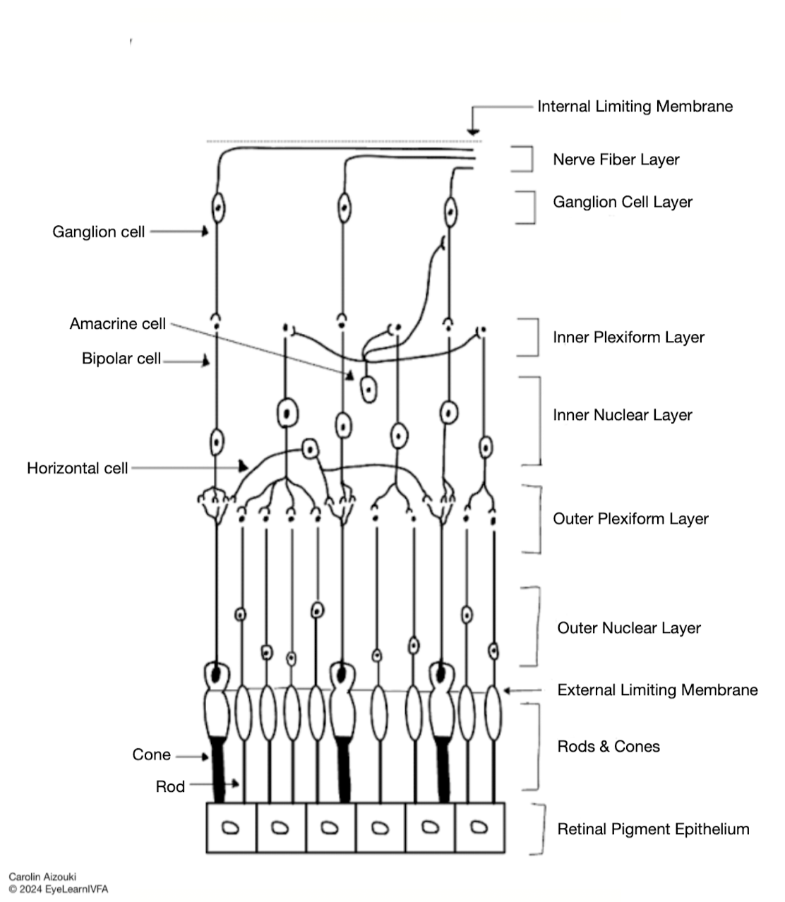 Inner Nuclear Layer: Cell bodies of bipolar cells, horizontal cells, and amacrine cells.