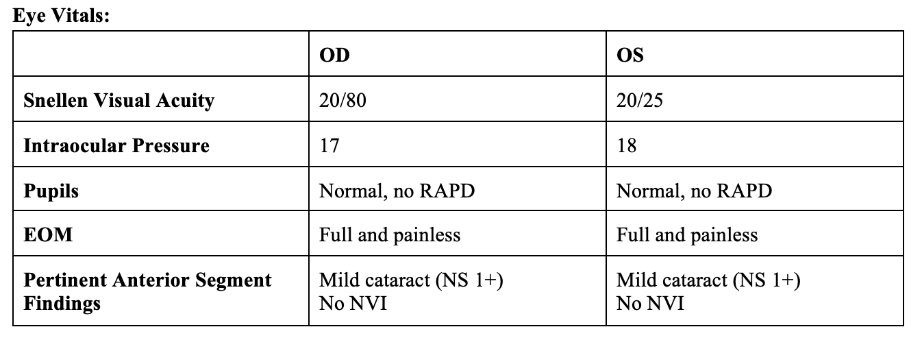 ID: 72F; referred for gradual onset of central vision distortion and blurring OD for 2 weeks