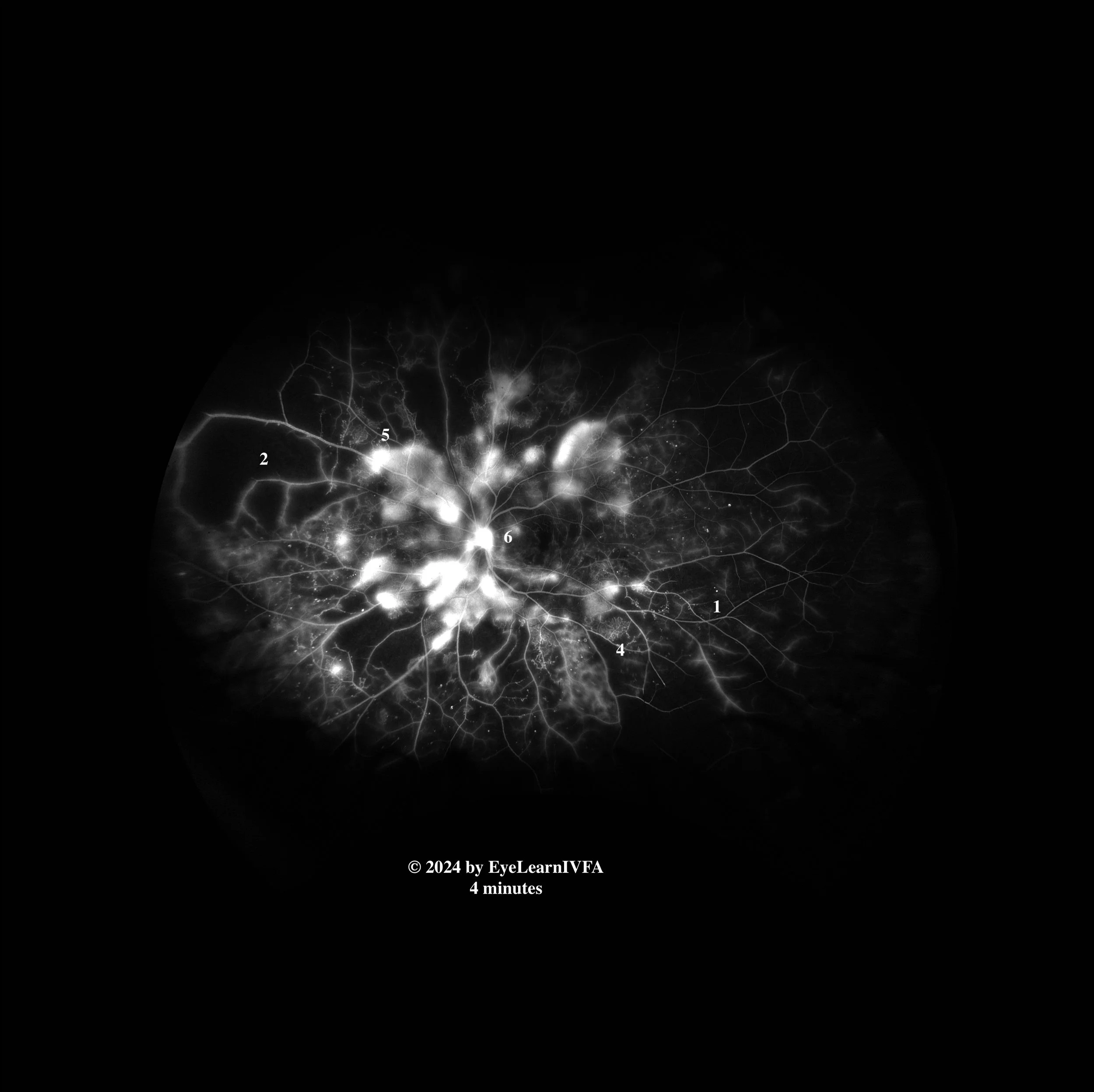 Ex. Posterior pole and peripheral hypofluoresence from hypoperfusion secondary to capillary drop out (2)
